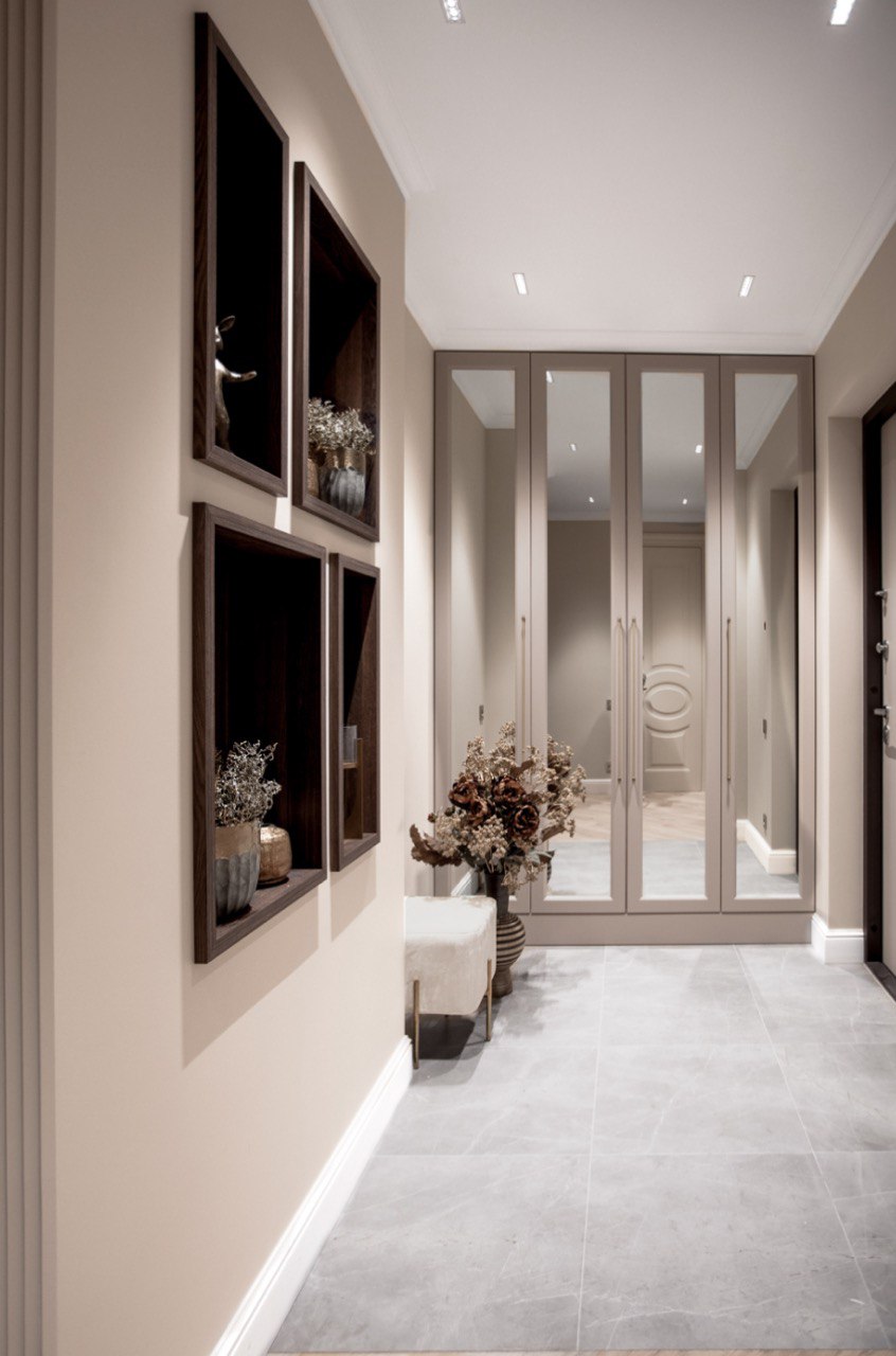 Шкаф в прихожей должен быть вместительным и функциональным, но не громоздким. Высокий шкаф-пенал или шкаф-купе с двумя дверцами подойдут идеально. Используйте верхние ярусы для хранения сезонной одежды, а нижние – для часто используемых вещей. Пуф с отделением для хранения заменит классическое сидение.